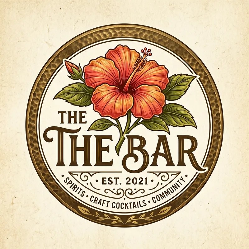 Generate an original, striking logo design for a place called 'The Bar'. The logo should incorporate a beautifully rendered Hibiscus flower as an integral part of the overall design. Utilize a color scheme that evokes a sense of warmth and relaxation, synonymous with a welcoming bar atmosphere.
