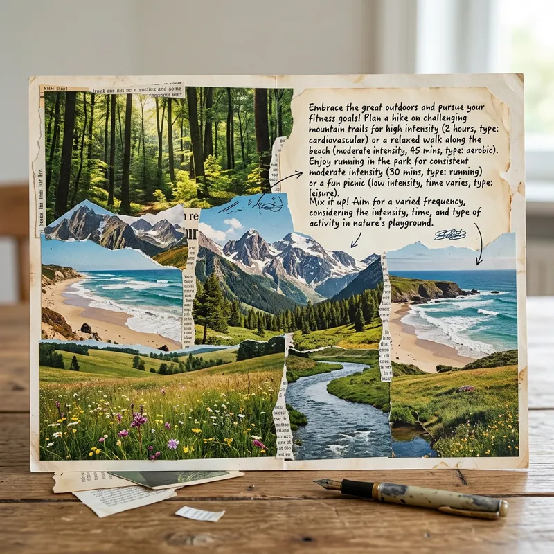 Create an image of a collage made from cut-outs of a variety of natural settings from newspapers and old magazines. The collage should include an assortment of outdoor scenes such as forests, beaches, mountains, and fields. Besides, there should be an empty space for a handwritten paragraph describing potential outdoor activities in these environments, such as hiking, surfing, running, and having a picnic, with a mention of fitness goals, intensity, time, and type of activities as part of the FITT (Frequency, Intensity, Time, and Type) principle.