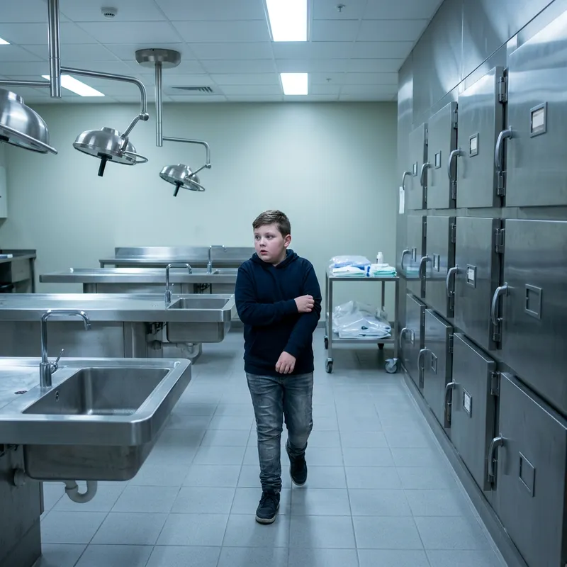 An overweight Caucasian boy is standing in the somewhat chilly environment that is a morgue. The room is filled with typical morgue equipment such as stainless steel autopsy tables, overhead lamps casting cold, bright lights, and transparent body bags waiting to be used. Rows of large, metal drawer-like compartments built into the wall conjure a sense of austerity and silence. The boy's eyes are wide with a mixture of curiosity and trepidation as he navigates the room.