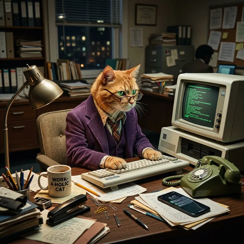 Overworked Orange Cat in 1970s Purple Suit at Busy Office Desk