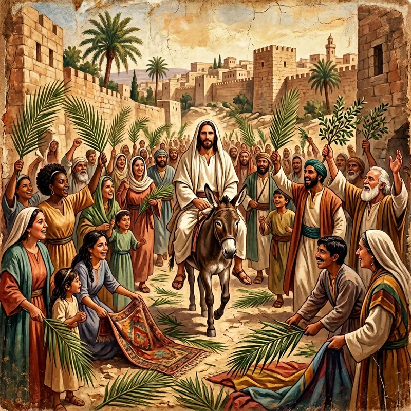 A historical depiction of Palm Sunday, featuring a Middle-Eastern man, presumed as Jesus, sitting on a donkey. The scene takes place on a dusty road, lined with people from diverse descents - Caucasian, Hispanic, Black, and South Asian. They are joyfully welcoming him, waving palm branches and laying cloths on the path. The atmosphere is cheerful and reverent. The style of the image is reminiscent of historical frescoes, with warm, earthy tones and expressive characters.