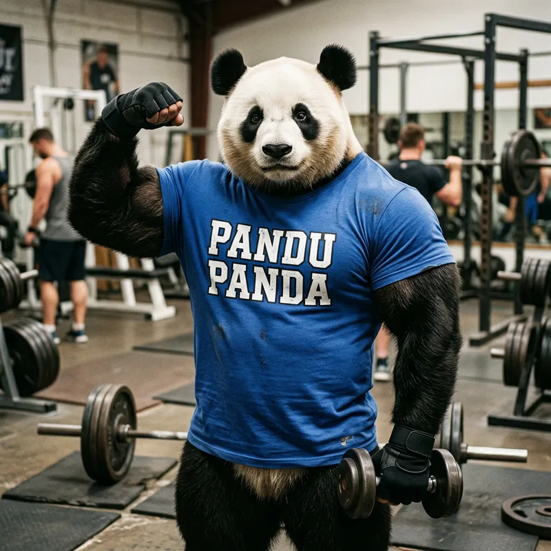 panda that has muscle and it will be wearing a blue shirt which pandu panda will be written on the shirt.