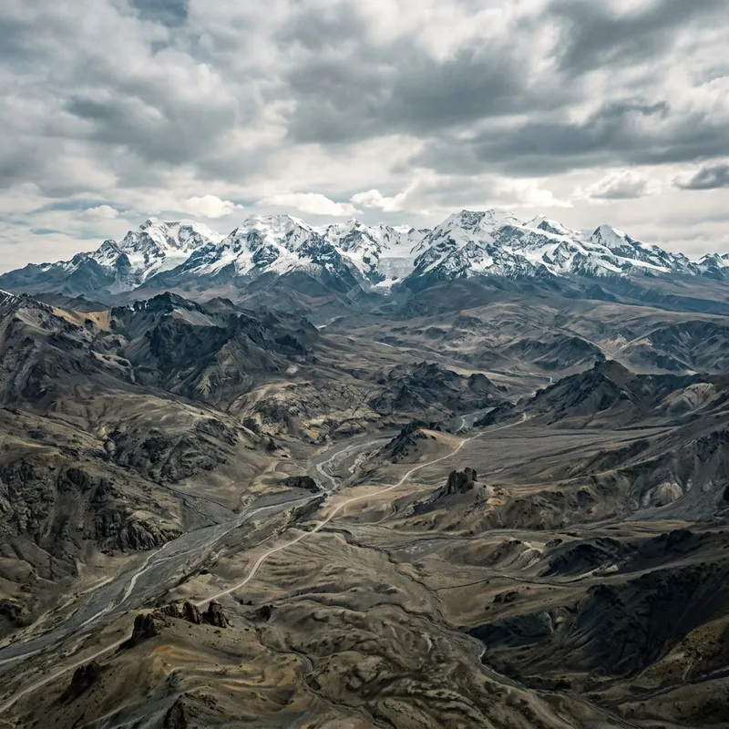 A grand panoramic view of a vast, barren terrain that extends endlessly into the horizon. Dominating the distant view are magnificent mountains, their peaks beautifully adorned with snow. This awe-inspiring landscape is envisioned from a bird's eye perspective as if filmed by a drone camera, emphasizing the magnitude of the setting. The imagery is presented in desaturated hues, contributing to a mood of desolation. This is a nature-inspired landscape, marked by its rugged simplicity and overwhelming scale.