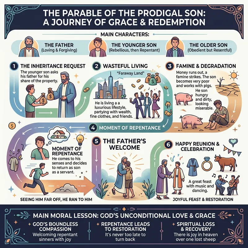 Create an infographic about the parable of the prodigal son. The infographic should clearly illustrate the story sequence, its main characters, and the moral lesson behind the parable. It should incorporate relevant symbols and icons such as a faraway land, a luxurious lifestyle, a moment of repentance, and a happy reunion. Use a visually engaging layout with a flow that easily guides the viewer's eye through the story. The text should be interspersed with the visuals. Remember to keep the tone neutral and the colors harmonious, ensuring the infographic is clear, educational, and aesthetically pleasing.