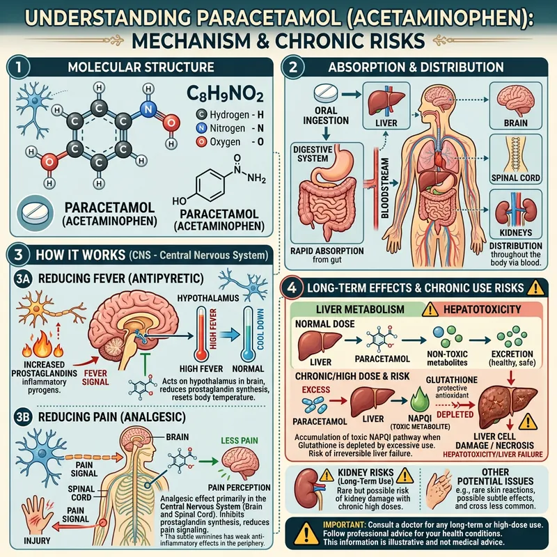 Visualize a detailed graphic of the medicine known as Paracetamol. Depict its molecular structure and mechanism of action within the human body. Design distinct sections showing how it is absorbed and distributed within the body, and how it mitigates pain and reduces fever via the central nervous system. Elaborate the long-term effects of this medication, visually representing any potential side-effects or risks associated with chronic use. Aim for an educational and informative design, integrating various layers of information from textual, to molecular and anatomical, for an easy understanding.