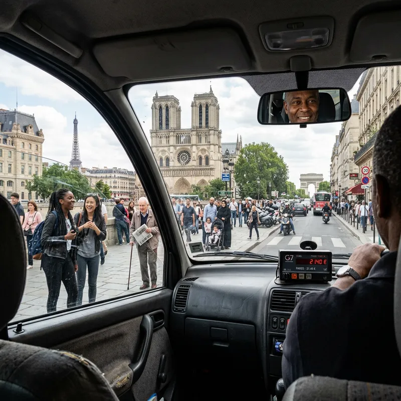 Photo of a taxi journey through Paris, showcasing iconic landmarks such as the Eiffel Tower, Notre Dame, and Champs-Élysées amid the bustle of the city. The interior of the cab is visible, reflecting a multicultural driver of African descent in the rear-view mirror. Peering out of the taxi window, we notice a diverse group of pedestrians of different genders and ages on the sidewalks, encapsulating the spirit of the city.
