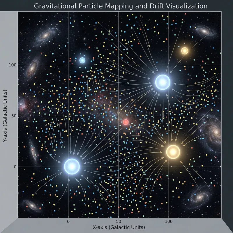 A scientific visualization illustrating particle mapping with gravitational effects. The image showcases numerous particles, represented as various colorful dots, spread across a galactic backdrop filled with stars. Draw lines between particles, influenced by gravity, causing them to drift towards bigger particles. Indicate these gravitational forces through curved arrows, and make the larger particles glow slightly to signify their gravitation pull. Please also include some sort of grid or axis for spatial reference.