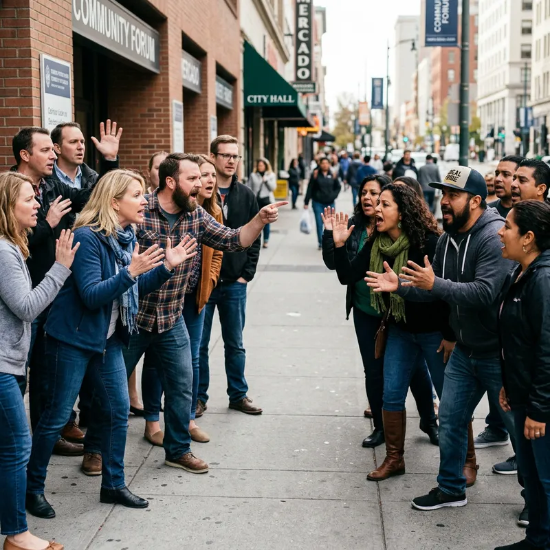 Two groups of people, one composed of Caucasian men and women and the other of Hispanic men and women, are standing opposite each other. They are involved in an animated discussion, waving their hands passionately as they put forth their points.