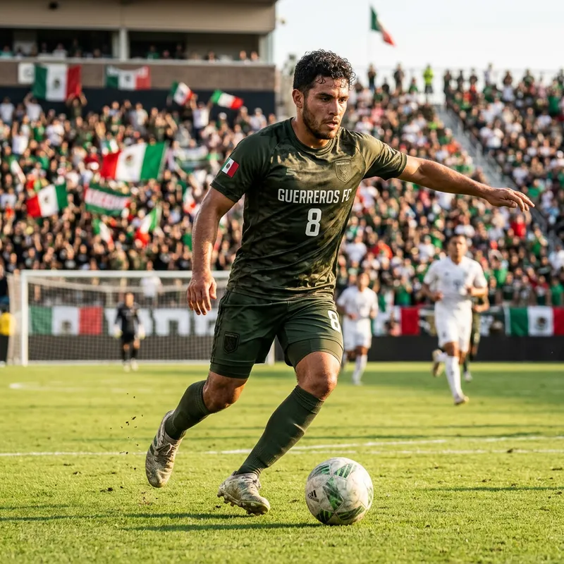 An image of a charismatic man with dark hair and a military-style outfit, of Hispanic descent, playing soccer. He is skillfully dribbling the ball, exhibiting a fervent passion for the sport. His eyes focus on the distant goal, ready to make a powerful shot. The scene occurs at a sun-lit soccer field filled with cheering crowd in the background.