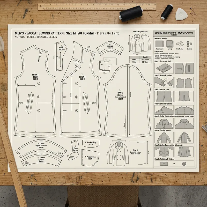 Men's Peacoat Pattern - Size M in Large A0 Format with Sewing Instructions without Hood.