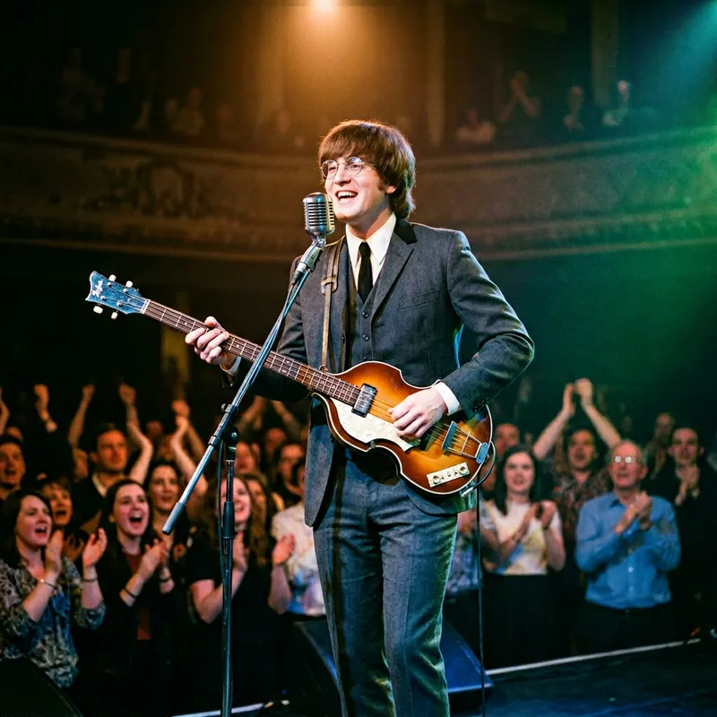An image of a man who closely resembles a famous musician from the 1960s. He has a mop-top hairstyle, round spectacles, and a boyish charm. He is playing an iconic bass guitar left-handed and singing passionately into a vintage microphone. He is standing on a stage with colorful spotlights illuminating him and the audience is cheering in the background.