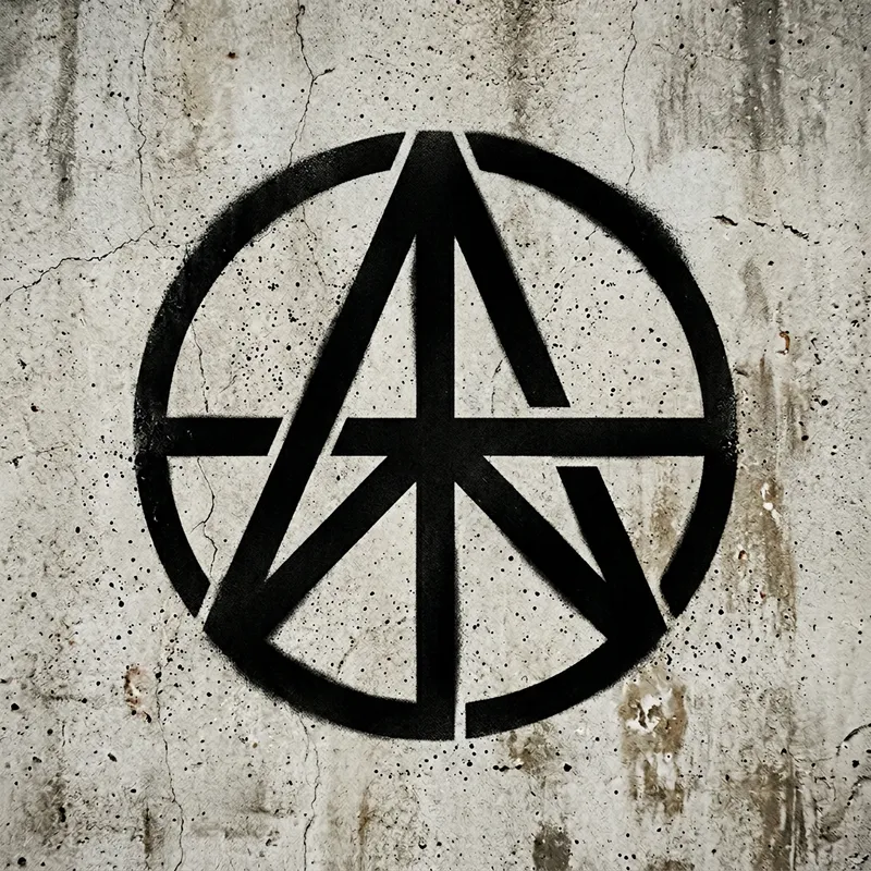 An illustrative stencil that combines the universally recognized peace symbol and the anarchy symbol. The peace symbol, commonly formed by three lines inside a circle, representing the desire for universal harmony and tranquility. And, the anarchy symbol, commonly represented as an 'A' inscribed within a circle, representing the belief in no rulers but rather a society based on voluntarism and mutual aid. The two symbols should be intertwined in a creative and visually appealing way, showing a harmonious merger of the two different ideologies within the same stencil design.