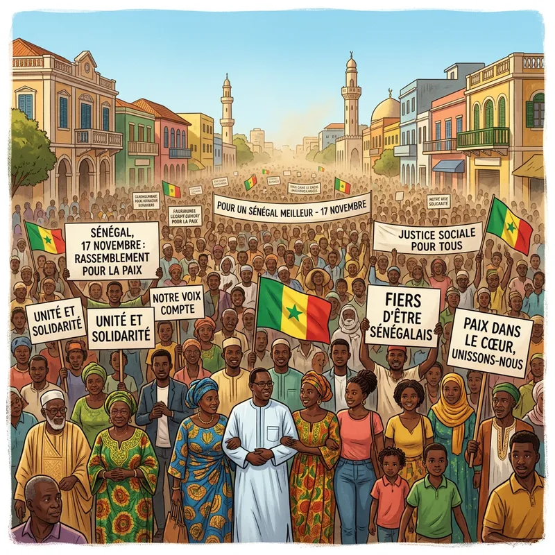 An illustrative scene of a peaceful public demonstration taking place in Senegal on November 17th. Camera's perspective showcasing a dense multitude of diverse individuals gathered together, expressing their beliefs and demonstrating unity through placards, flags, and banners. The backdrop featuring archetypal senegalese architecture in the daylight under a clear sky. Include representation from various age groups and equal gender representation among the crowd.