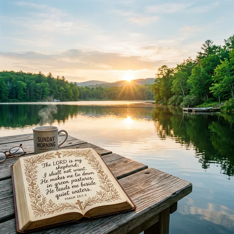 An image that could be used as a Facebook background, the scene portraying a peaceful Sunday morning with elements like a rising sun casting warm, golden rays on a serene lake surrounded by lush, verdurous trees. Alongside these elements, an open Bible on a wooden table in the foreground with a verse visible, surrounded by a hand-sketched decorative border. Colors are predominantly calming hues like soft blues, gentle greens, and warm yellows.