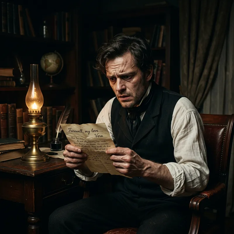 A scene unfolds in a 19th-century setting. A Caucasian man named Pechorin sits on a mahogany chair in his dimly lit room, his face filled with frustration and despair. He holds a farewell note in his hand, carefully penned by a woman named Vera. The paper's edges are slightly curled, perhaps from Pechorin's tight grip. The strange discomfort in his eyes comes from the realization of parting. His breathing grows heavier, his hands tense up and his pale forehead wrinkles as he retrospectively soaks in the words on the parchment. The burnished table lamp casts a long shadow on his face, enhancing his surprised expression. The room's poignant silence is only broken by an occasional flip of the note paper.