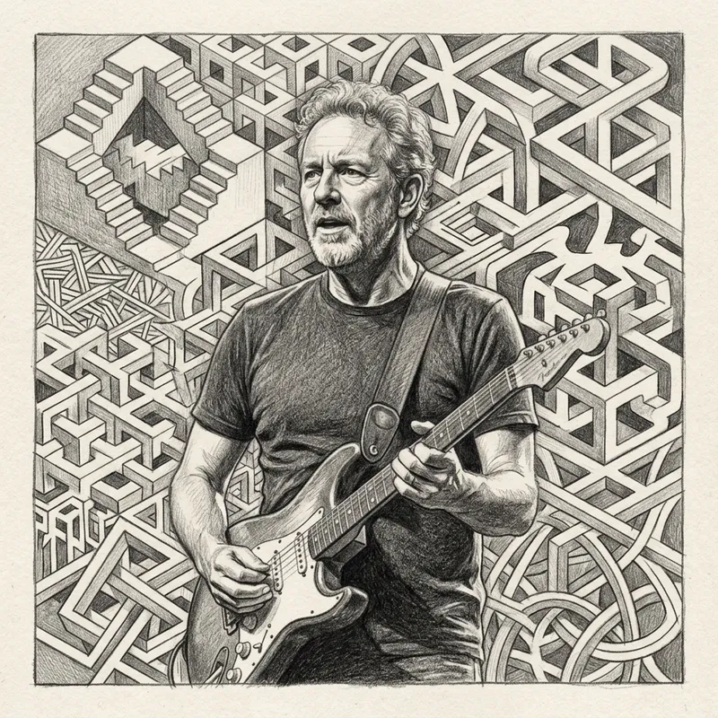 Pencil drawing of a middle-aged man with an electric guitar. He has short beard, is wearing a black T-shirt, and has grey hair. In the background, there are paradoxical patterns.