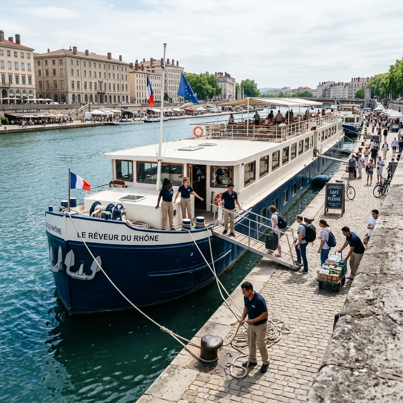 Imagine a large penichette-style passenger ship. Its broad shape is characteristic of the design, made for river navigation, with an elongated body and a horizontally-flat top. The ship is currently docked on the side of a bustling port. Lively activities are happening around the port with mixed-gender crew members of various descents hustling and bustling around. The ship is tethered securely to a sturdy gray mooring wall, awaiting its next voyage. Azure waters lap gently against the hull's smooth exterior as a light breeze rustles around the port.