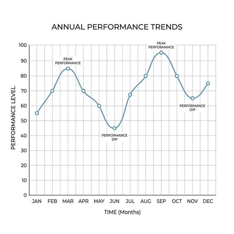 A detailed line graph demonstrating performance levels over time. The x-axis represents time progressing from left to right, usually segmented into months or years. The y-axis represents the performance levels, with higher values indicating better performance. The line graph shows a pattern of peaks and troughs, indicating fluctuations in performance over the specified time period. The graph is plotted on a white or light colored grid with horizontal and vertical lines representing the x and y axes. The graph is on a plain background and is present in a clean, minimalist style.