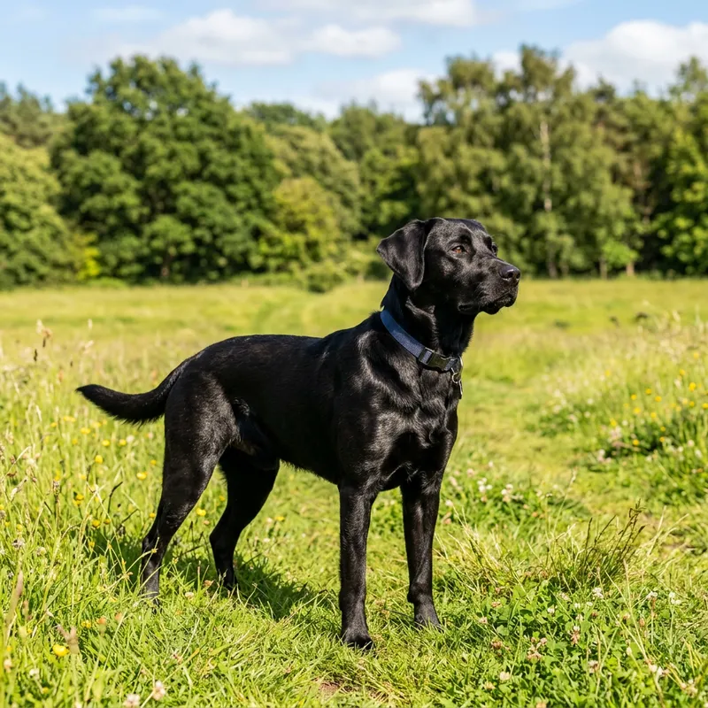 A black dog standing in a grassy field with trees in the background. The dog is a medium-sized breed, with a shiny black coat and bright, intelligent eyes. The dog stands alert, looking off into the distance, as if it has spotted something of interest. The sun is shining brightly, casting an ambient glow on the scene and highlighting the glossy sheen of the dog's coat.