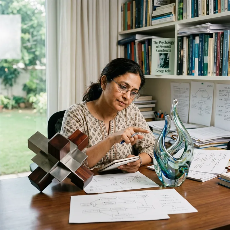 Present an image that embodies the ideas of the Person Construct theory. Designate a composition that shows an individual examining two different objects. Each object, creative and abstract in sight, will symbolize different constructs. The individual, a middle-aged South Asian woman, is actively comparing and organizing these constructs. Her body language and facial expressions should communicate curiosity, concentration, and thoughtful deliberation. The surrounding environment is a serene study room filled with resources indicating psychological research and theory.