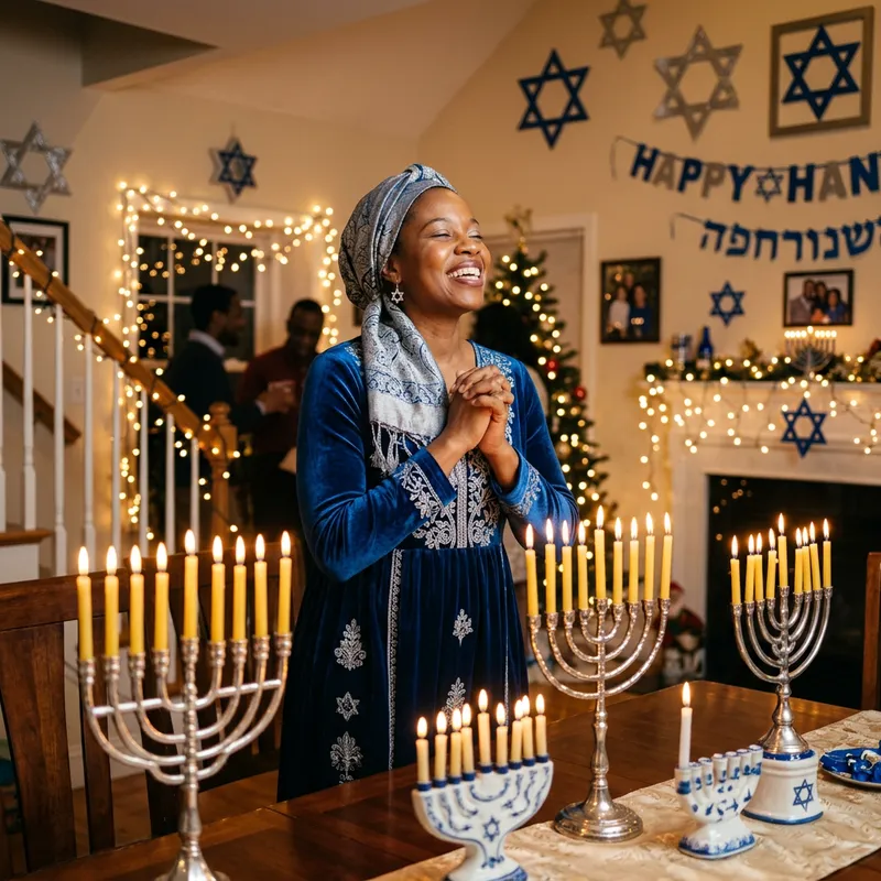 person from USA celebrating Hanukkah surrounded by lit menorahs and twinkling lights wearing beautiful modest outfit in blue and silver or traditional festive attire, with Star of David decorations in background, joyful spiritual pose, radiant celebration expression, warm menorah and twinkling lights.
