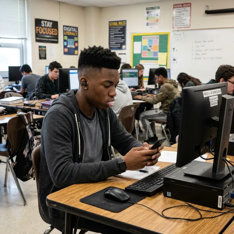 A person with an oblong face, sporting a fade haircut with black hair. This individual has earbuds in their ears and is holding a smartphone in their hands. They are chewing gum, and seated in a classroom setting in front of a school computer.
