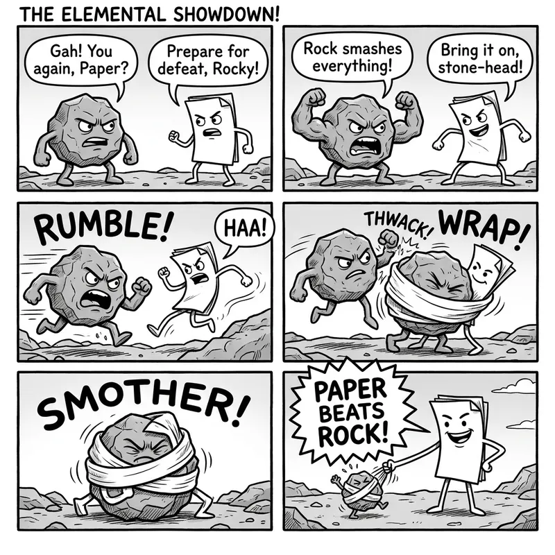 Comic book page featuring two characters conceptualized as personified objects - one resembling a rock and the other resembling a sheet of paper. Both characters have thin outlines and are devoid of color, implying grayscale tones. The character representing paper is seen triumphantly holding a speech bubble that exclaims, 'Paper Beats Rock!'