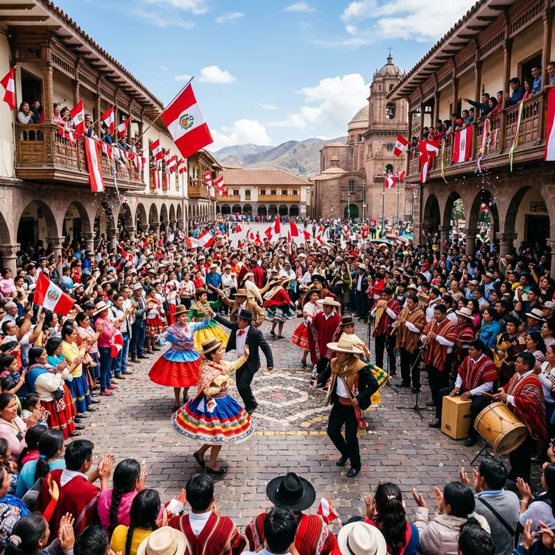 A lively and vibrant celebration of Peruvian independence, highlighting Peruvian folklore. The scene unfolds in a sunlit plaza filled with crowds of joyous people. Men and women in traditional Peruvian costumes, representing a range of descents including Indigenous and Hispanic individuals, energetically perform folk dances. Musicians play traditional Peruvian instruments, filling the air with festive melodies. Spectators, of diverse descents and genders, line the plaza with smiles on their faces and clap in rhythm with the music. The surrounding architecture showcases majestic colonial-era buildings with balconies adorned in vibrant streamers and Peruvian flags billowing in the wind.