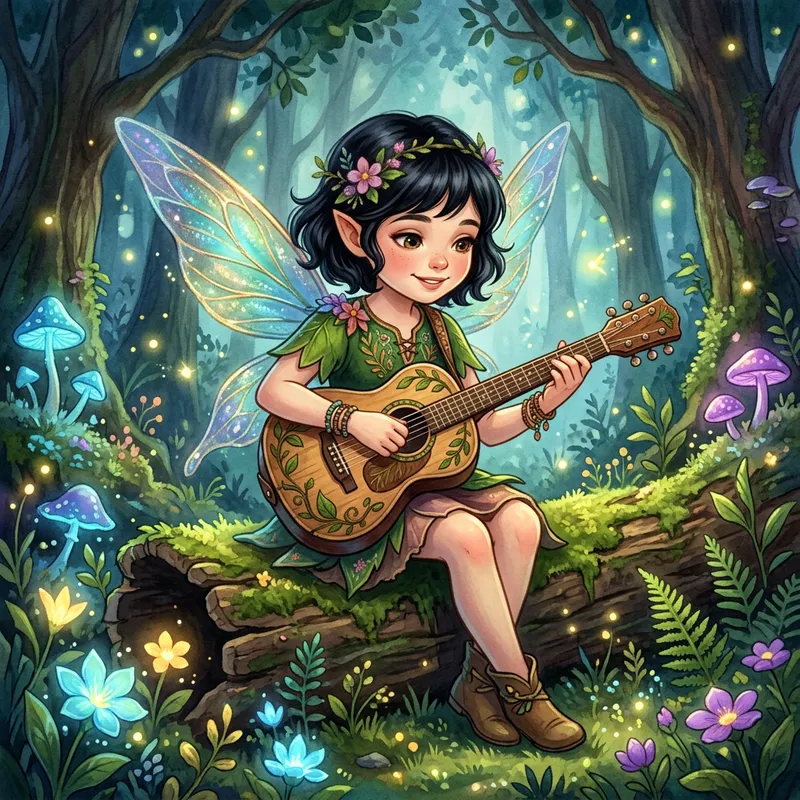 Illustration of a petite fairy girl with short black hair and tender eyes, she is of white descent and is strumming a guitar.