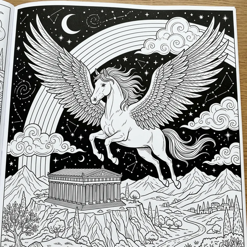 Pegasus is at the center of the image, flying majestically in a starry sky. Its wings are large and open, with detailed feathers for creative coloring. In the background, a rainbow and some fluffy clouds. Below Pegasus, mountains or a simplified Greek temple (like the Parthenon).