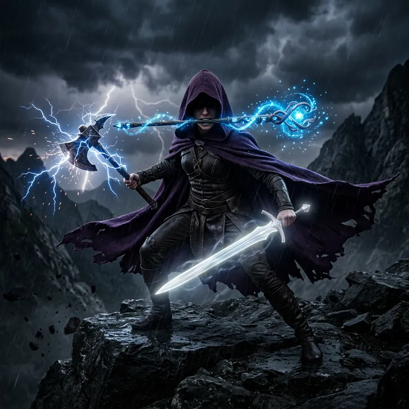 A phantom-like figure donned in a deep purple cloak, hood hiding her face into a shadow. She wields in one hand a weapon that crackles with electricity, an embodiment of a thunderstorm - that's the Maelstrom. In her other hand, she holds a brilliant, shimmering sword, streaming with a soft glow, the essence of a summer moonlight - Yasha. Between her teeth, she clenches a mystical staff twinkling with sparkling, azure energy, radiating an arcane aura - Kaya. Her stance is fearless yet agile, ready to spring forth into battle, reminiscent of a seasoned warrior.