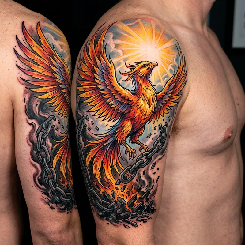 Design a powerful tattoo symbolizing someone who has triumphed over adversity and abuse. The tattoo should include a phoenix rising from the ashes, as an emblem of rebirth, resilience, and strength. Around the phoenix, add a motif of broken chains signifying release from the past. To demonstrate the triumph over darkness, part of the design should see the bird ascending towards a source of light. Incorporate rich, vibrant colors to signify hope and renewal. The tattoo should exude an aura of courage, determination, and survival.
