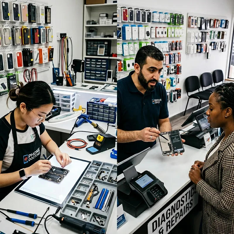An intricate and detailed scene of a phone repair shop. An Asian woman precisionly using a set of small tools to work on a dismantled smartphone that lays on a lighted table. Small parts lay in a neat array next to her. Meanwhile, a Middle-Eastern man is speaking to a customer explaining the diagnostics of a phone he holds in his hand. The customer is a Black woman who listens attentively. Around, you can see a variety of phone cases, charging cables, and other phone accessories displayed neatly. The ambient is well-lit and professionally organized.