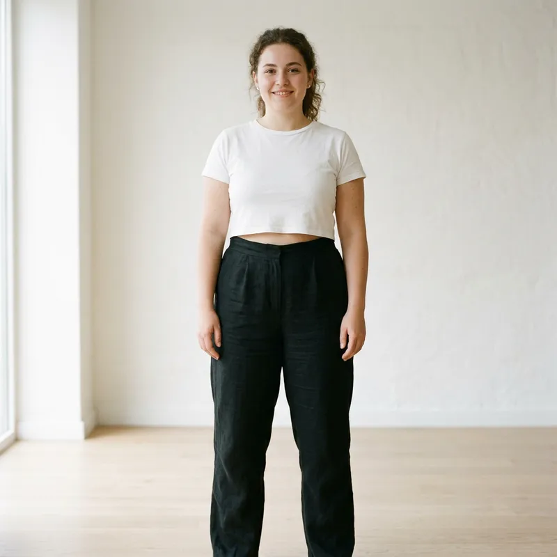 Photo-realistic full-figured young woman in a white crop top and loose black pants, standing straight in a neutral pose. Her body is naturally rounded, with a visible waist but a little extra weight. The composition focuses on the belly, with soft, natural lighting and a clean, neutral background. The style is realistic, high-resolution.