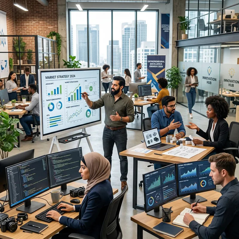 A photography contest with the theme of capturing entrepreneurial excellence. The scene should depict multiple innovative environments showcasing collaboration and growth. For instance, depict a bustling office or shared workspace where a diverse group of individuals are deeply engrossed in their tasks - a Middle-Eastern woman is writing code at a high-tech workstation, a Hispanic man is presenting a strategy on a digital whiteboard, a South Asian man is collaborating on an innovative project with a black woman at a conference table, and a white man is studying market trends. The atmosphere is vibrant and dynamic, embodying progressive thought and ceaseless striving for excellence.