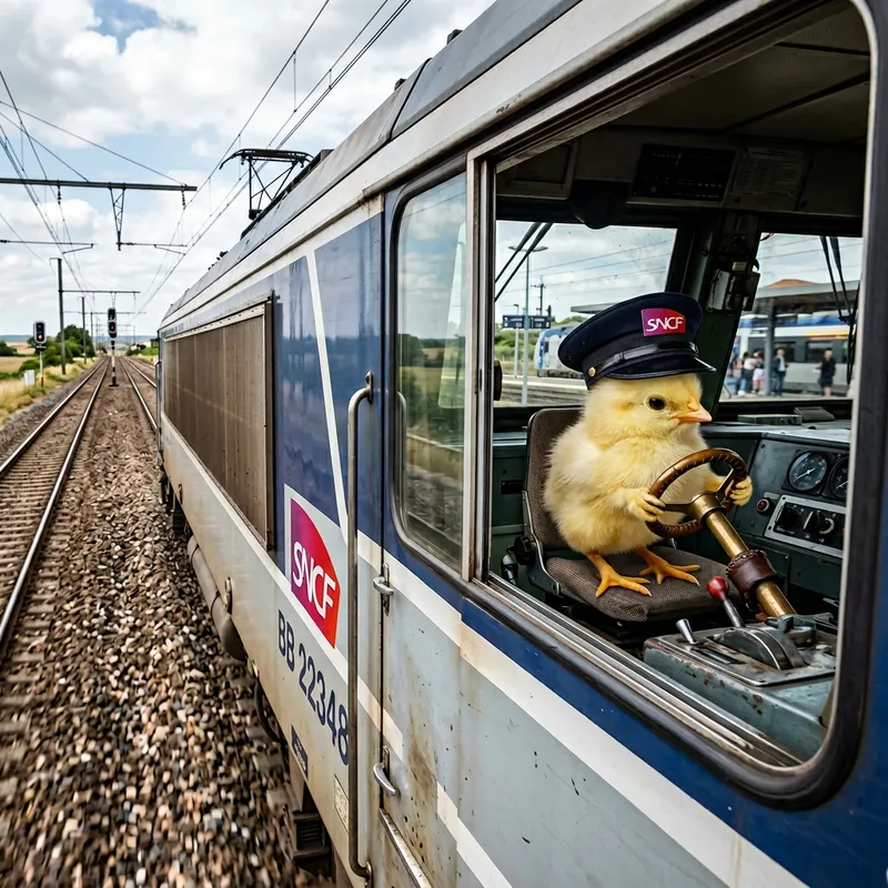 Generate a photorealistic image of a chick driving a train, as seen from a profile view outside the train. The chick is inside the cabin, at the helm, holding the steering wheel with its feet and seated on its chair. The chick is wearing a French National Railway Company cap.