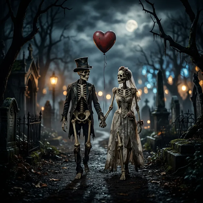 Photorealistic image of two skeletons holding hands with a heart shaped balloon floating with a creepy yet romantic bokeh effect with a very Tim Burton style of imagery.