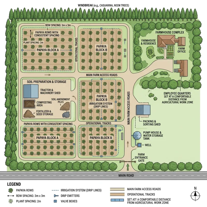 Pictorialize a layout or blueprint of a modestly sized farm. The design should include essential papaya farm elements such as rows of plants with consistent spacing, windbreaks, irrigation systems, and an area for soil preparation and storage. Incorporate a simple yet functional layout the farmhouse is set a comfortable distance away from the hustle and bustle of agricultural work. The paths should promote easy navigation and provide efficient connectivity across the farm premises.