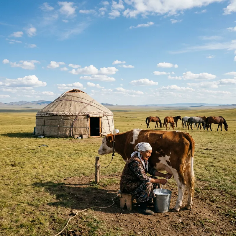 Picture a tranquil open steppe under a vast blue sky. In the midst of this serene landscape, a traditional Kazakh yurt stands tall. Next to the yurt, a Kazakh grandmother with a kind face and weathered hands is busily milking a cow, expertly filling a bucket with fresh milk. A few steps away from her, several horses are grazing peacefully, their silhouettes against the sweeping expanse of the steppe adding to the scene's rustic charm.
