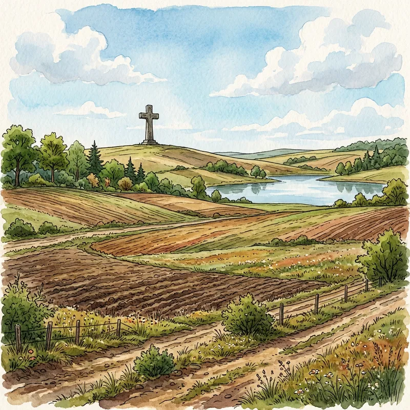 Imagine a picturesque 2D landscape. The dominant feature of the scene is a vast expanse of soil, varied in its texture and colour, suggesting a rich blend of nutrients. On the horizon, there is a large cross, perhaps made of worn stone, standing solitary. Further afield, a serene lake mirrors the hues of the sky above, its placid waters undisturbed. Surrounding these elements, a lively woodland thrives. However, these woods don't dominate the scenery, they're just a little feature that adds a touch of wild beauty to the scene.