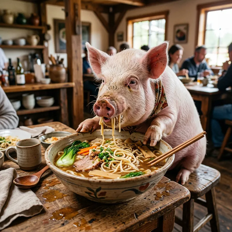 An image of a pig, indulging in a large bowl of noodles.