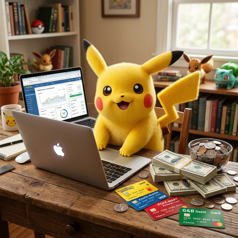 Pikachu is sitting full-face, at his apple laptop, and there are money and coins debit cards on the table