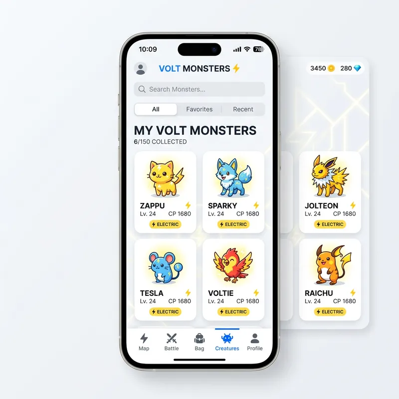 An application with minimalist design elements, which is themed around showing vibrant, cute, electric-themed cartoon creatures, similar to a worldwide popular creature-catching game. The app should have a minimalist user interface, with simple geometric shapes, monotone color schemes with pops of bright colors, clear typography, and plenty of white or negative space.