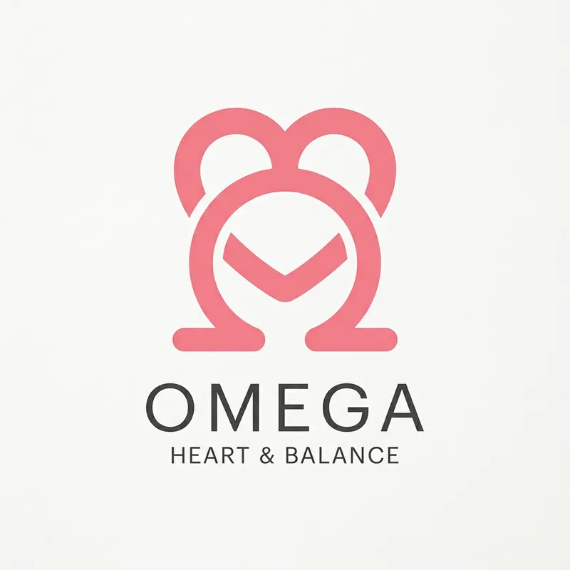 Design a logo that incorporates a two-dimensional pink heart perfectly blended with the Greek symbol for omega. The design should be clean and unique, combining both elements in an interesting and harmonious way that maintains the integrity of each symbol. Pay attention to the details without overly complicating the design. Use a simple, minimalist approach for a modern, sleek, and professional look.
