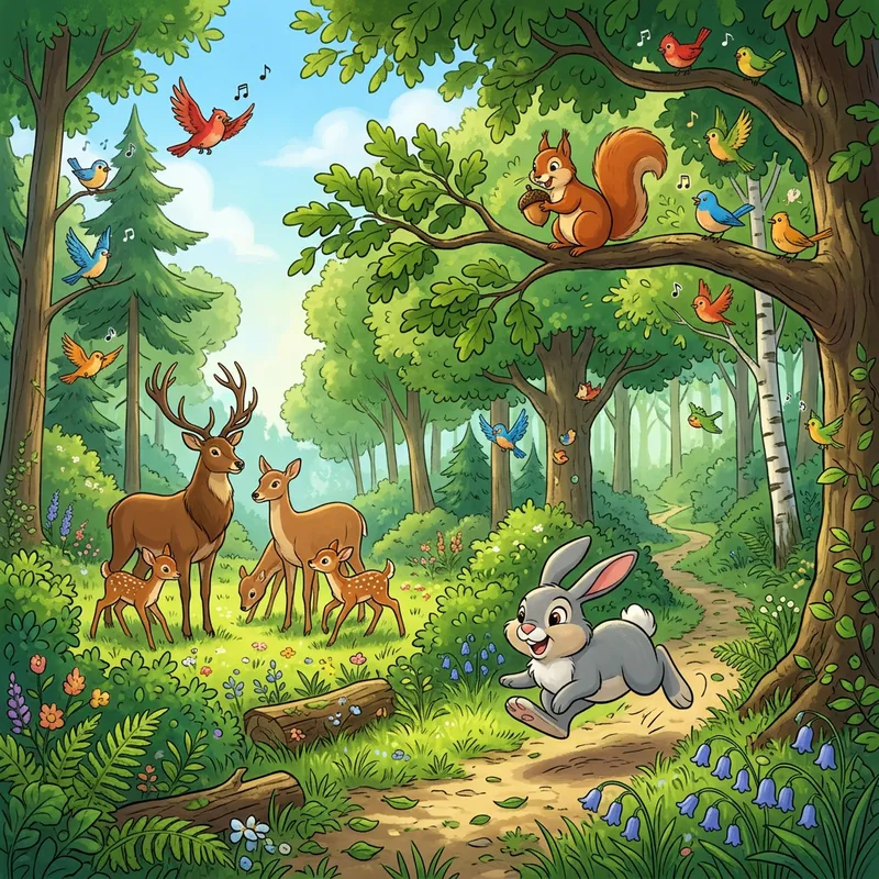 An animation style scene showing various animals interacting in a cheerful woodland environment. The scene depicts a gray rabbit happily hopping among the tall, green trees, its long ears flopping with each bounce. A squirrel with a bushy tail is perched atop a tree branch, munching on an acorn. A family of deer, complete with a sturdy stag, a graceful doe, and three adorable spotted fawns, are seen grazing in a nearby clearing. Birds chirp harmoniously from the trees, their feathers bright and multicolored. Despite being an image, the scene seems full of lively movement and joyful chatter.