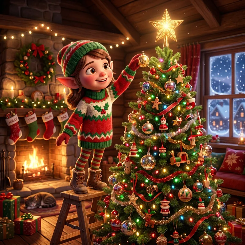 Pixar-style 3D animation with highly detailed textures and realistic lighting, charming character design with expressive faces and emotional depth, vibrant saturated colors with professional ray-traced rendering, polished cinematic quality with subtle imperfections for warmth and personality decoration of Christmas.