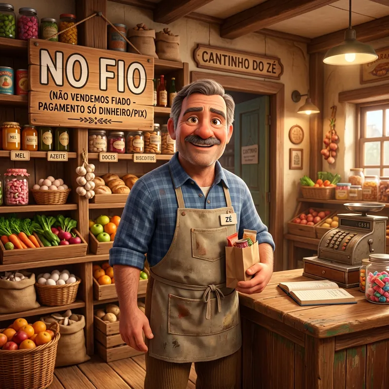 Pixar-style image of a friendly shopkeeper standing in a small cozy store, emphasizing a clear bold text that says 'NO FIO' as a sign of no credit given, bright warm colors, expressive character with a welcoming but firm look, detailed background with shelves of products, high-quality Pixar animation style.