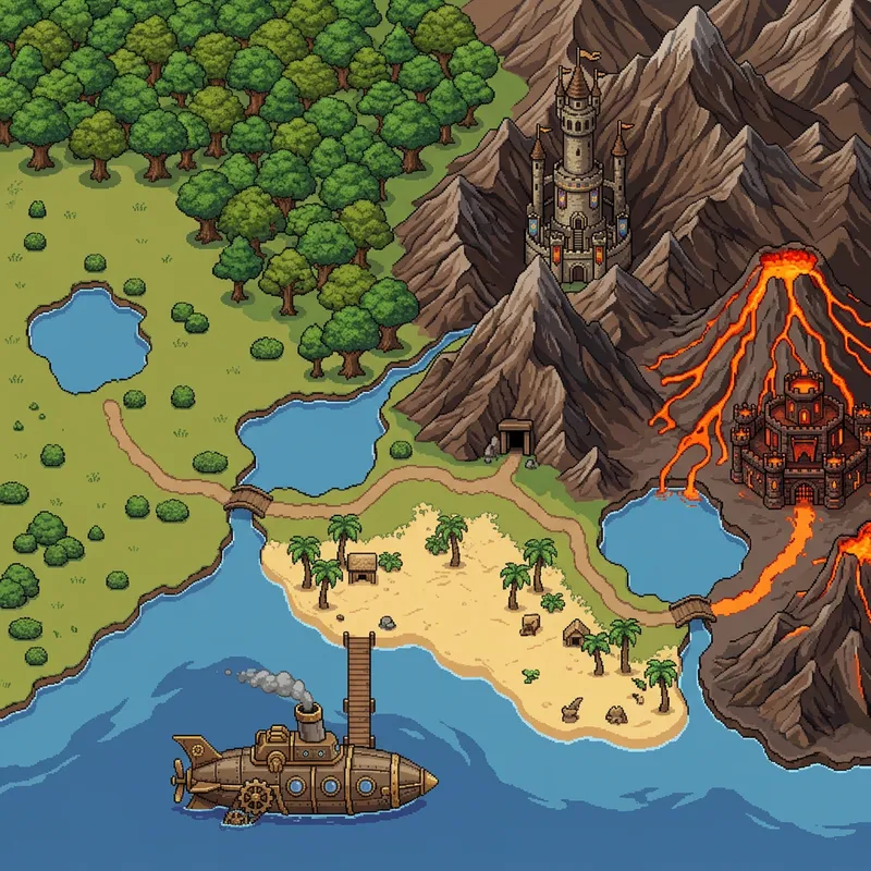 Create an intricate pixel-art style image envisioned from a top-down view at a distant angle. The left-most region hosts a plain with scattered bushes and a petite lake. To its right spans an oak forest filling the top half of the view. Further right, massive steep mountain ranges without a speck of snow are displayed, cradling a towering castle with a narrow circumference perched on a peak, and a diminutive mine entrance at the foot of a mountain. To the south of the mountains, and east of the forest, lies an inviting beach embellished with sporadic palm trees. Below the beach, the vast ocean is home to a vintage steampunk submarine, with a connecting footbridge. Beyond the mountains to the right, a formidable volcano seethes with flowing lava, housing a fire-themed castle by its rim. All areas subtly merge into each other, signifying fluid transitions. Calm lakes separate these areas, connected by quaint bridges with winding paths leading to strategic points across the regions. This image should instill a blend of adventure and curiosity, appearing suitable for a level-selection screen in a video game.