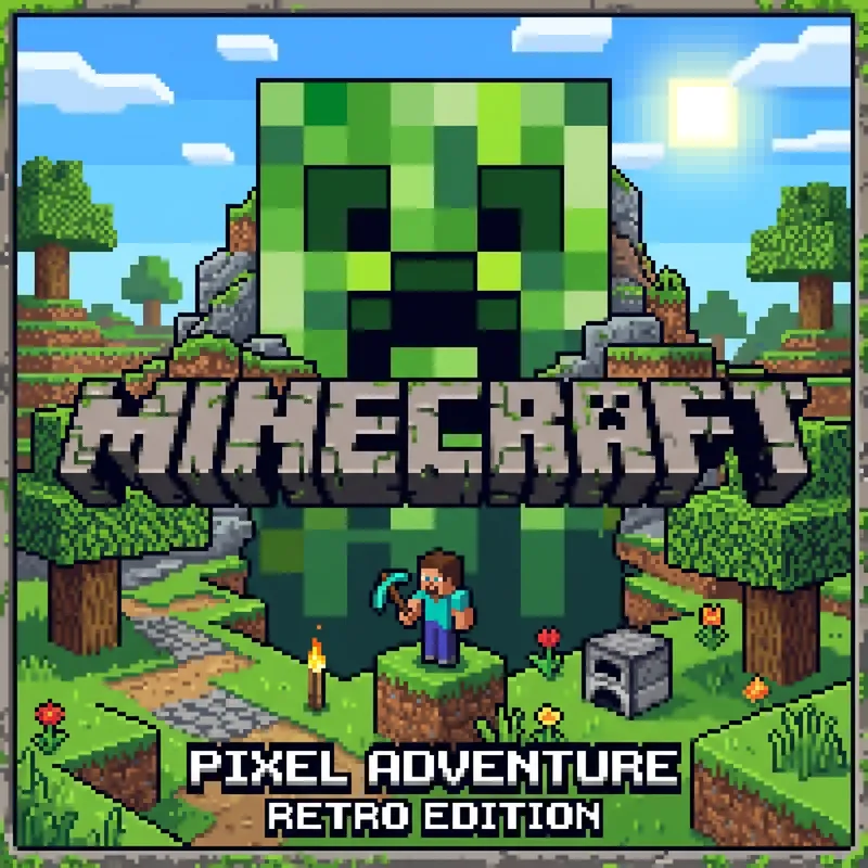 Create a detailed low-resolution pixel art style image resembling the Minecraft logo. The image should be inspired by retro video game graphics, featuring vibrant colors and blocky shapes. The design should give a subtle nod to the iconic creeper character from the game. This image should be a digital illustration, maintaining the overall aesthetic of pixel art.