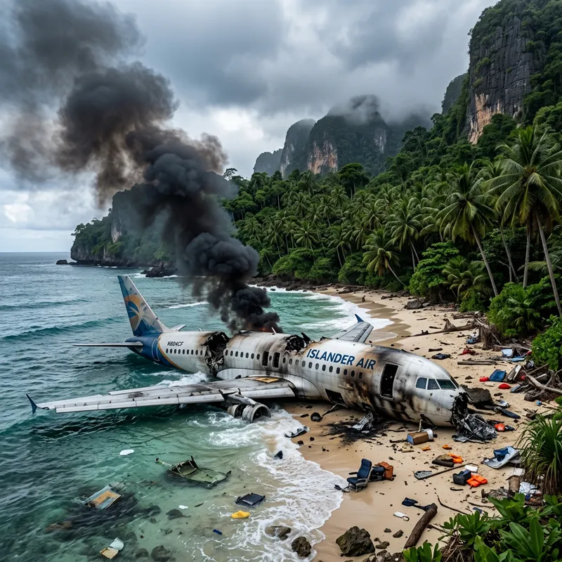 An image showing an airplane crash scene on a mysterious, exotic island surrounded by dense, lush vegetation. The plane debris is scattered across a sandy beach, with parts of the plane half submerged in clear ocean water. Dark smoke is seen fuming from the crash site into the sky. The unknown island gives a sense of isolation with its towering palm trees and rugged cliffs. The overall ambiance is one of danger, mystery, and intrigue, all set in a 16:9 aspect ratio.